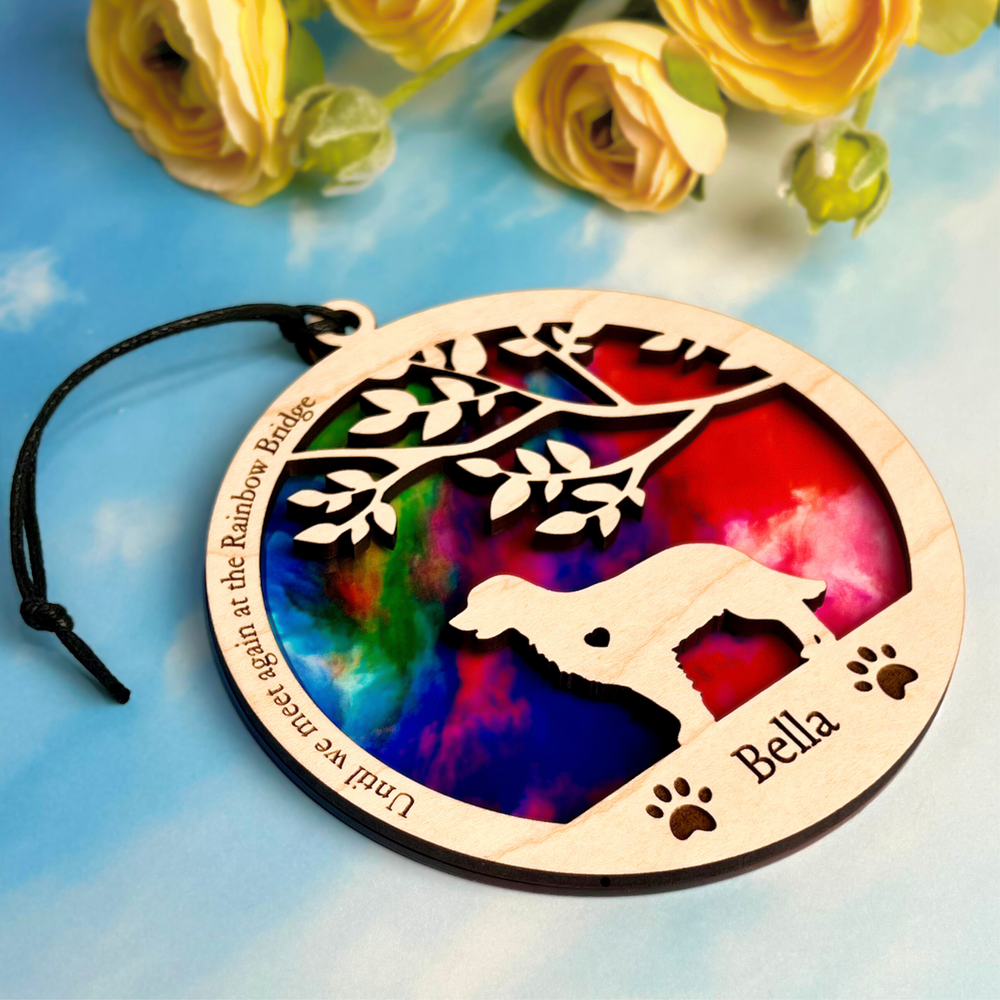 •    Light Catching Background: The stunning rainbow background captures light beautifully, making it a beautiful window display to honor your pet.  This pet loss ornament symbolizes the Rainbow Bridge, offering a touching reminder of your pet's journey to a better place.